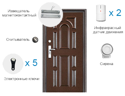 | Охранная сигнализация — 1 контактный извещатель, 2 датчика движения, сирена, электронные ключи Touch memory |