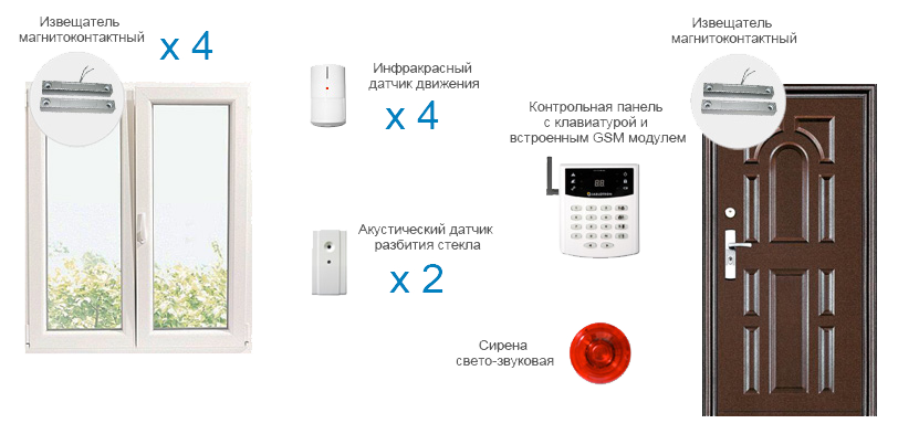 - 4 магнитоконтактных извещателя на окна и 1 на входную дверь;